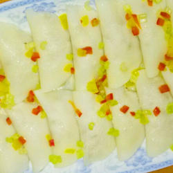 1. Peel the spring bamboo shoots, cut off three centimeters from the bottom (too old, cut them out for soup), and then cut them into 2 mm thick slices.14 slices are just enough to make a plate.Blanch the bamboo shoot slices in boiling water and drain them