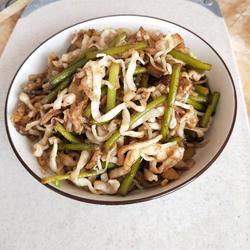6.Add potato strips and garlic sprouts and stir-fry evenly