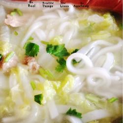 3. After the water boils, add the marinated lean meat and sausage and cook until half-cooked.Add salt and chicken powder.Then add the green vegetables, cook until cooked and taste.Then add the rice noodles and blanch them before serving.Finally, add coriander and You can eat sesame oil.