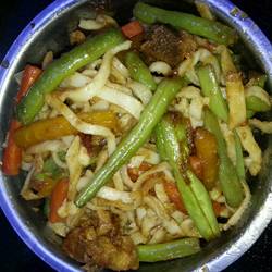 3.Put oil in the frying pan, pour beans and potatoes , stew the radish strips and add noodles, then simmer until cooked