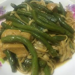 Heat oil in a pan, sauté green onions, ginger and aniseed until fragrant.Stir-fry green beans until they change color.Add soy sauce, chicken powder, oyster sauce, stir-fry, add water and bring to a boil.Be sure to simmer the green beans until a small amount of soup remains.Remove the noodles from the pan.