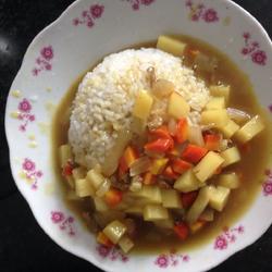 1. Prepare 1 potato, an onion, a little carrot, a little pork (or other meat), and a box of paste curry (more fragrant and more flavorful than curry powder).