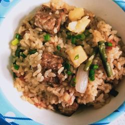 11. Pour the freshly fried vegetables into the rice in the rice cooker, stir the rice and water evenly with a spoon, and cover the soup with The amount of rice is about ten knuckles.You can increase or decrease the soup according to your personal taste.Cover the lid and set the time to start cooking
