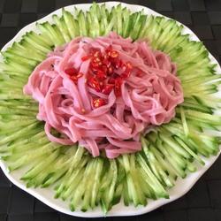 6.Cook the noodles and put them on a plate, cut the cucumber into shreds and cut the red pepper into mince.Presentation.