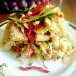 5. Cut the bell pepper and cucumber into shreds, pour the seasoning chili oil into the gluten
