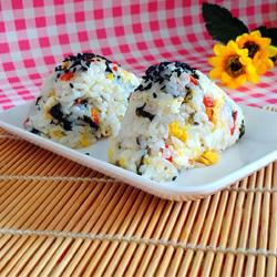 5.Use disposable gloves to mix the rice and vegetables evenly , arrange them into triangles on the chopping board, or directly shape them into round rice balls