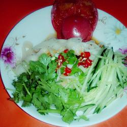17. Remove the water and put it on a plate, sprinkle with coriander, chives, pepper, chopped cucumber shreds, and tomatoes Just decorate