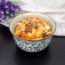 9. Pour in the green onions, carrots and potatoes and stir-fry, then add an appropriate amount of soy sauce and cooking wine , salt, and five-spice powder and stir well quickly.