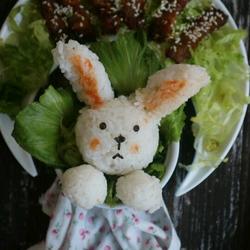 6. Put the big rice ball, and then put two oval rice balls on top of the big rice ball to become rabbit ears, and put the two small ones on top.Put the round balls under the big rice balls and they will become the legs of the rabbit.After sorting them, dip the chopsticks into the tomato sauce and smear the ears and face.
