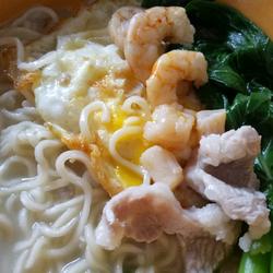 4. Remove the fried poached eggs from the bottom, add the shrimp strips and scallops, stir-fry over low heat, and pour in Boil the dried shrimp scallops with an appropriate amount of water for 20 minutes, then add lean meat, noodles, green vegetables, green onions, and salt