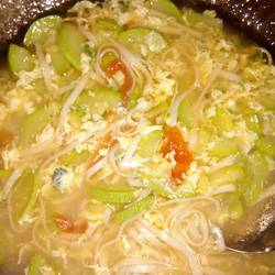 6.When the water boils, add the noodles and tomatoes.When the water boils again, pour in the eggs.