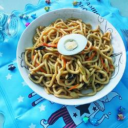 7.Pour in the noodles, add salt, soy sauce and oyster sauce and continue frying