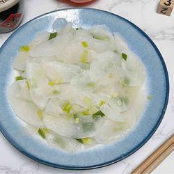 1.First cut the white radish into thin slices and the green garlic into thin sections