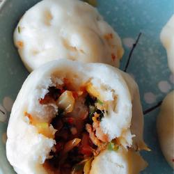 4.Put oil in the pot, add ginger and garlic and sauté until fragrant, add cabbage, and stir-fry the peppers Stir-fry, add a little vinegar and chili sauce, stir-fry until cooked, add minced coriander, green onions, garlic sprouts and continue to stir-fry, stir until fragrant, then add the minced meat from before and stir evenly.Dish out the filling and set aside.