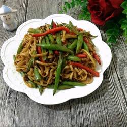 7. Then add the mixed noodles and red pepper shreds and continue to stir-fry.