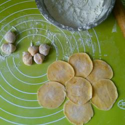 7.This is the rolled out pumpkin dumpling wrapper, the color is quite beautiful, wrapped into The dumplings are beautiful when cooked and golden!
