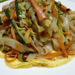 6. Beat the eggs.Chop green onions.Cut carrots, ham, cucumber and cabbage into shreds and set aside.