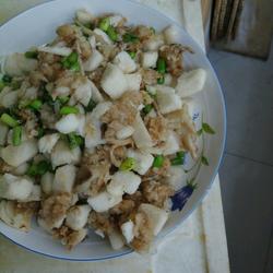 1.Cut the steamed buns into cubes and the green onions into sections