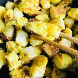 4. Pour a little sesame oil into a hot pan, then pour in the mixed eggs and steamed buns and fry over low heat