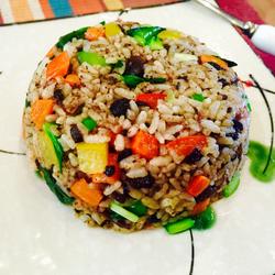 3. Heat the pan with cold oil.When the oil is warm, add the diced carrots, stir well and then add Stir-fry the dace with black bean sauce until fragrant, then add the rice to the pot and stir-fry the rice.Then add diced red and yellow bell peppers and diced green cabbage heads and stir-fry.