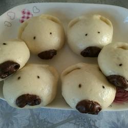 8.Pinch both sides to make ears and two sesame seeds to make eyes.Use a chopstick tube on the nose to make two empty piglets
