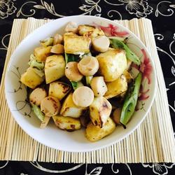 1.Cut the steamed buns into cubes, slice the ham sausage, and cut the green onions into diamond-shaped pieces