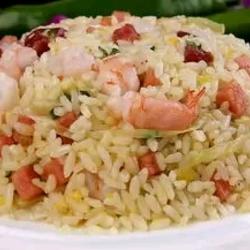 5.Add rice and blanched vegetables, ham, etc., and add all seasonings Ingredients, stir-fry constantly over medium heat.