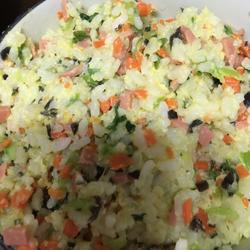 4.Put an appropriate amount of oil in the pot, add chopped green onion, stir-fry until fragrant, add ham sausage, carrots, rapeseed, fungus, rice, and finally add eggs, stir-fry evenly, and remove from the pot