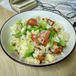 5. Add five-spice powder until fragrant, add onions, carrots, and ham and stir-fry over medium heat until soft.