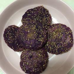 5.After stirring evenly, use your hands to take an appropriate amount of purple sweet potato puree and form it into a ball, dip it in sesame seeds and press it into a cake