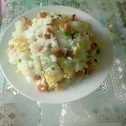 4.Put the oil into the pot and add the eggs.When the eggs are cooked, put the rice into the pot and chop the green onion.Add ham and salt and stir-fry