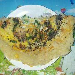 4. Add eggs to the quick-forming cake.Crack the eggs directly onto the cake, smooth it with a shovel, and then wait a moment., watching that the eggs are almost cooked, start adding sesame seeds
