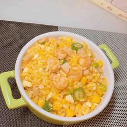 2. Put the corn, meatloaf, and edamame , pour the shrimp into the pot, add a little salt and fry the cooked rice
