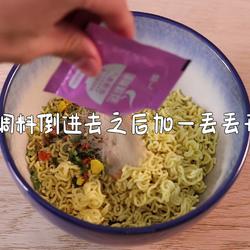1. Flatten the instant noodles, add the seasoning packet and pour a little boiling water