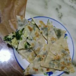 6. Roll out two of the doughs separately.They must be thin and the two sizes should be almost the same.Spread the seasoned leek and egg filling on one of them.Place the other dough on top of the stuffed dough and pinch the edges together with your hands.The cake embryo is almost ready.