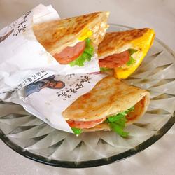 2. Defrost the hand cake for a short time, preheat the electric baking pan and place it on top.The ham slices are a little cold after being taken out of the refrigerator.I also heated it for a while and fried both sides of the cake until golden and crispy