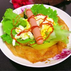 7.Put on lettuce, ham, and eggs , if you like to eat ketchup, you can add some, and the delicious hand cakes are ready