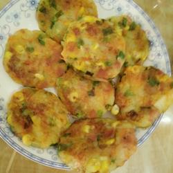 3. After the potatoes are cooked, use a rice spoon to crush them into mashed potatoes.Pour the cut pieces into the mashed potatoes, add an appropriate amount of salt and two spoons of flour and mix evenly.
