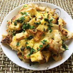 7.Put oil in the pan, pour in the diced buns and spread them out (the buns are too dry) Sprinkle some water, cover the pot and simmer for a while)