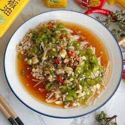 1.Enoki mushrooms, minced green and red peppers, diced rattan peppers, and minced garlic are ready