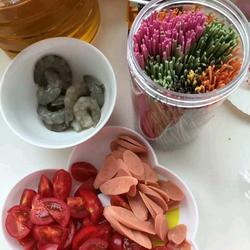 2.Peel the shrimps, slice tomatoes, and slice ham