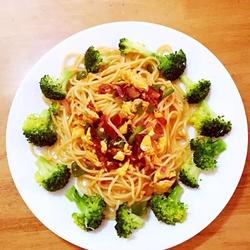 3. Scramble eggs, onions, and finally add pasta and tomato sauce, mix well, and arrange broccoli on a plate.Serve with pasta! Finish!