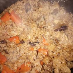 2. Stir-fry the short ribs with onion, ginger and cooking wine until the oil turns golden brown.Add carrots, mushrooms and bamboo shoots and stir-fry together.Add appropriate amount of salt, soy sauce for color, and light soy sauce for freshness.Then put the washed rice into the pot and stir-fry together.Follow the same steps as with vegetable rice, then pour it into the rice cooker and add an appropriate amount of water.