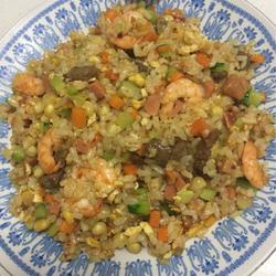 2.Put in the diced steak with shrimp oil, Stir-fry shrimps and diced mushrooms, then add corn, ham, eggs, carrots, and cucumbers in sequence