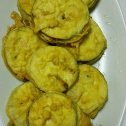 5. Wrap the eggplant slices sandwiched with meat velvet evenly in the cornstarch paste, fry them in the oil pan until both sides When golden brown, remove and filter the oil.