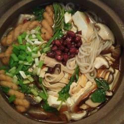 3. Take a casserole with a little water, because the rice noodles will not absorb much water after soaking, and add the seasonings.Put the rice noodles on the gas stove and cook with a lid.When the rice noodles are six times cooked, add the shiitake mushrooms and cook for about two minutes.Add the tofu skin and bean sprouts.