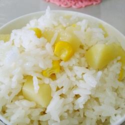 4.Put the stir-fried potatoes into the rice cooker, mix with the washed rice and an appropriate amount of corn, pour in the cooked bone soup, make sure there are more potatoes and rice in the soup, and press the cooking button