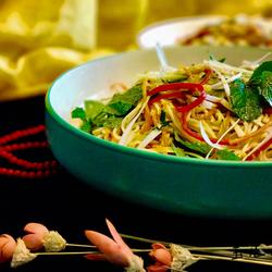 12.Put the noodles into a large container, add cucumber shreds, green onion shreds, and mint in order Leaves (you can leave them out if you don’t like them), shredded carrots and red peppers, minced garlic oil, chopped peanuts, sugar, light soy sauce, salt, balsamic vinegar (you can add chicken essence or MSG if you like).
