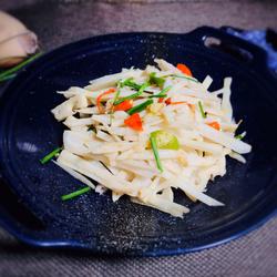 1.Peel and wash the lotus root, cut into shreds, wash off the surface starch, drain and set aside