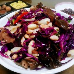 2. Cut the purple cabbage, add 1 spoon of salt and 1 spoon of sugar and marinate for ten minutes Then squeeze out the water.Boil the soaked peanuts, lilies and fungus for a while in boiling water, take them out and clean them.